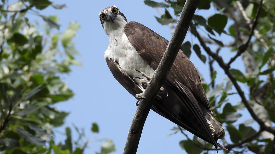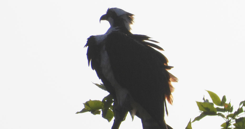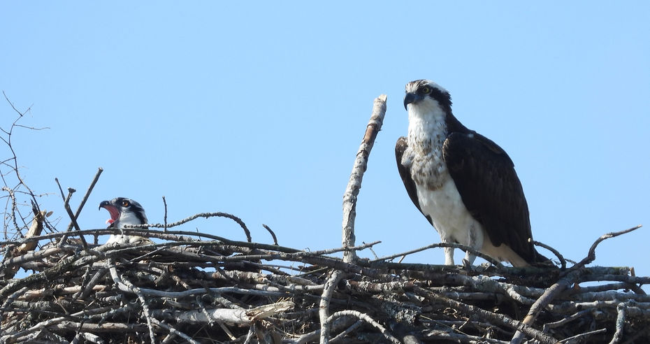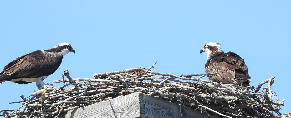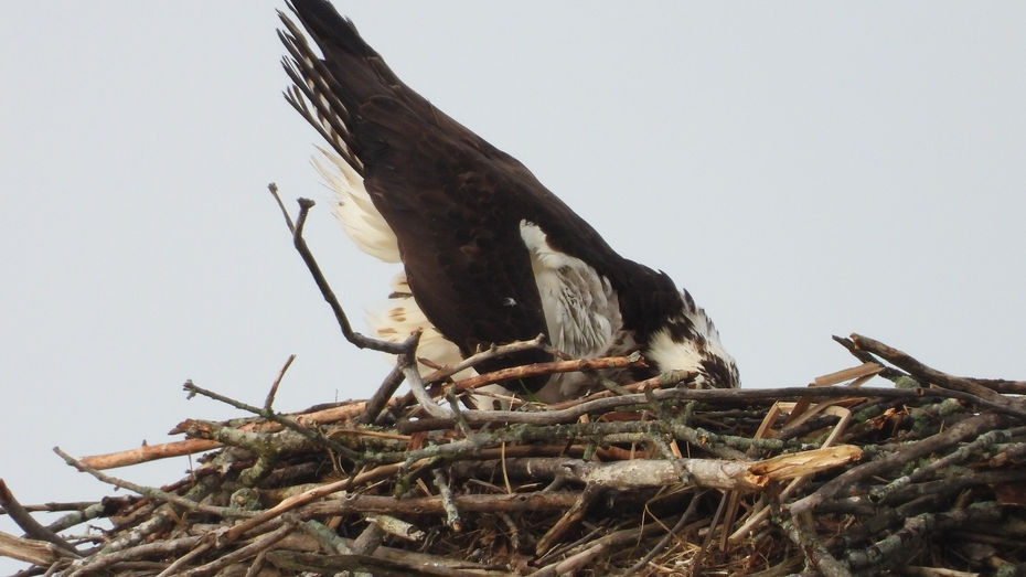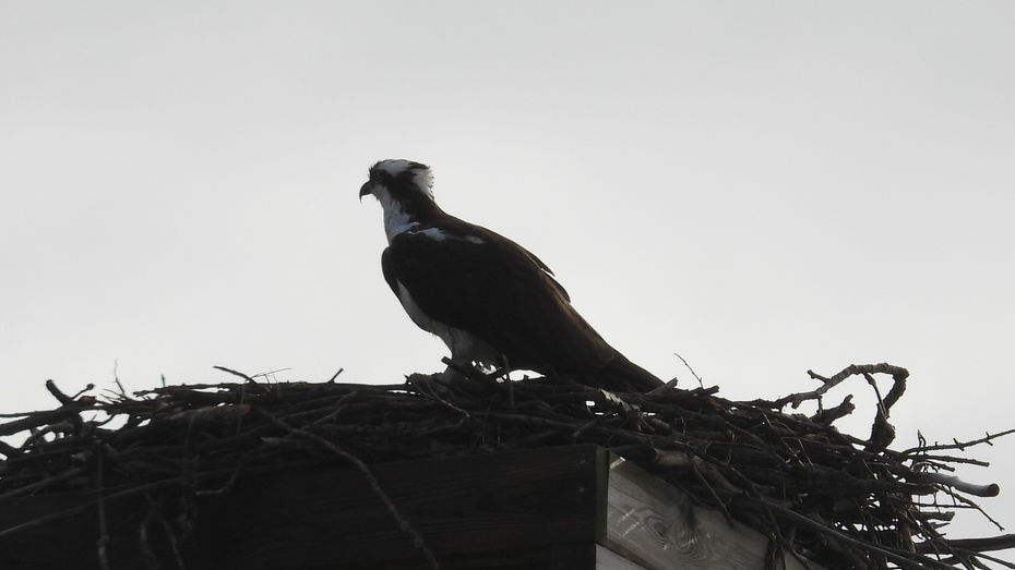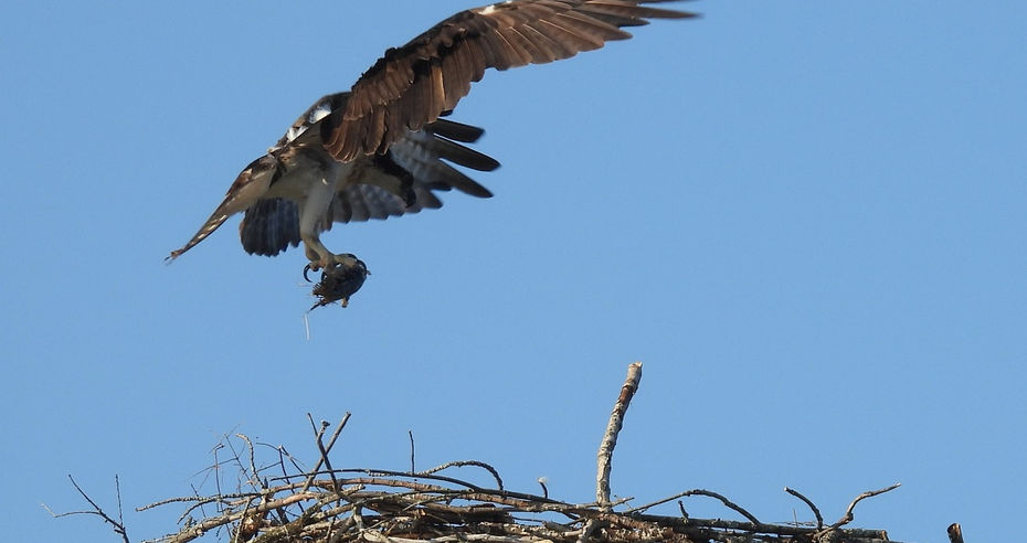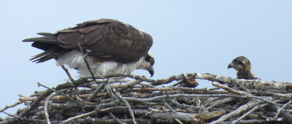 June 5, 2020. Still no definitive sightings of young ospreys (but I do think there is at least one hiding in the nest). The male brings home a large fish for dinner, then leaves and the female gets on with a spot of home renovation. Even an osprey nest could do with a tidy now and again. Actually, especially an osprey nest, what with that tangle of sticks!