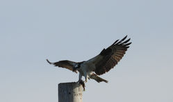 The remaining pictures were taken early the next day. When I arrived the male osprey was on the roof of the house nearby. The female was on the nest. Within seconds of my arrival she flew to join the male on the roof. I imagine she told him to chase away that nasty man with the camera because he immediately took flight. She then flew back to the nest. The male made several circuits of the nest (and me). He exploited the prevailing wind to stall very nearly over the nest - hence the relatively large number of pictures of him in flight that are actually in focus. Twice, he landed to the side of the nest (also shown in the photographs). When I came back he left the nest and flew to a nearby power pole and...