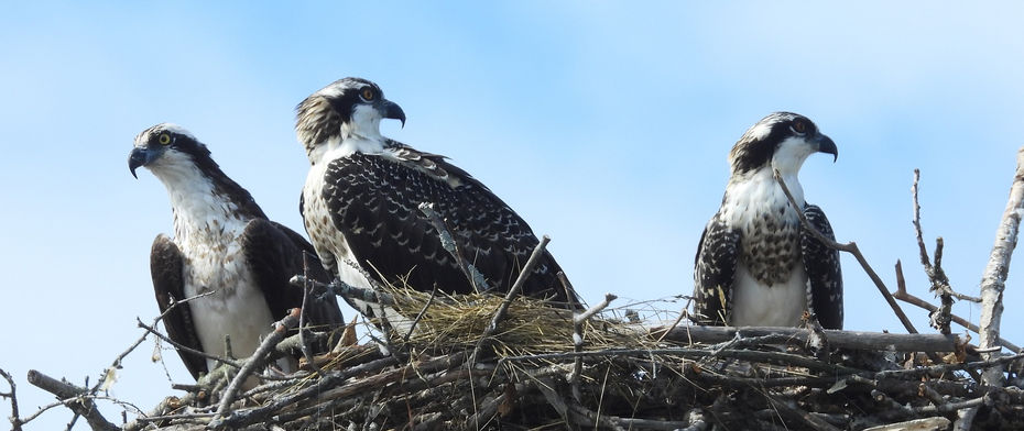 July 5, 2020: This album contains pictures from 4 separate visits to the nest that I made on July 1 and 2 of 2020. The first set shows the female adult watching over the young ones. The second set shows her feeding one of the young ospreys. In the third set the female osprey became decidedly agitated by the presence of a jogger and she took wing carrying the partially eaten fish she had in her claws. (Note to self: look up osprey feet because they seem to have difficulty letting go of fish once caught.) She flew several loops around the nest (there was no other adult home for these minutes) during which time she was repeatedly mobbed by a kingbird. These insect eating birds are tiny in comparison to an osprey and the fish hawk surely poses no threat to a kingbird, yet there it was, attempting to fly into the body of the osprey. Eventually the osprey flew far enough away that the kingbird gave up that attack and the osprey came back to land on the nest. Some of my pictures from that landing are in this album. (I witnessed a kingbird mobbing the male osprey the day after.) July 2 was a very hot day and in the last set of pictures you can see the birds with their beaks wide open to cool down as much as possible. It must get very warm on top of that pole in the baking sun all day!