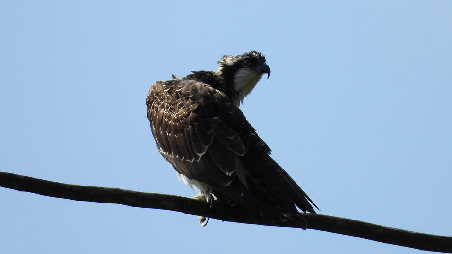 The second sequence was taken early afternoon on July 30. One young osprey was atop a long dead tree trunk, the other high up on a branch of another dead tree. I did not see either of them go for a fish, but clearly the first one is at least wondering "what do I do now?" The second one has other things on its mind, a dragonfly that invaded its space (see the last picture in this set).