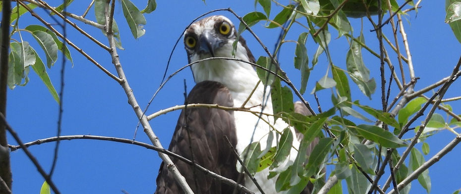 The pictures in this gallery were taken late afternoon on June 1, 2020. The female was in sitting position while the male was high in a tree overlooking the road and Goose Bay. He barely gives passing cars a look, but he clearly does not like me and if I get too close to the foot of his tree he will fly off. Of course, it's not just me he does not like, any passing human is too many to tolerate.