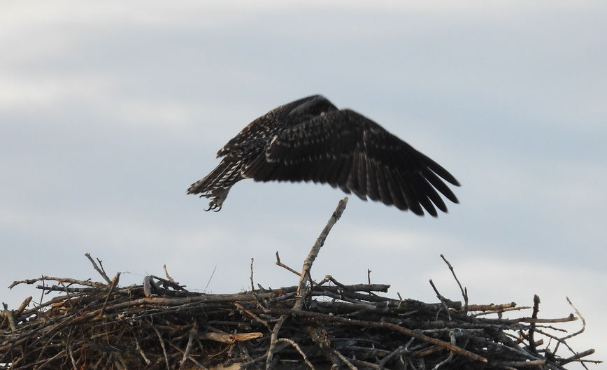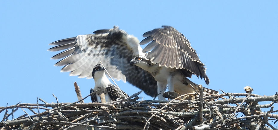 July 28, 2020: Both young ospreys now have their wings (pun intended). On this occasion one of the young birds launches itself into the air, does a quick loop and returns to the nest. It did this a couple of times before screaming in delight (I make that up, of course) when its sibling returned.